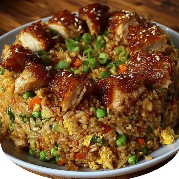 2. Plate fried rice, top with sauced chicken.