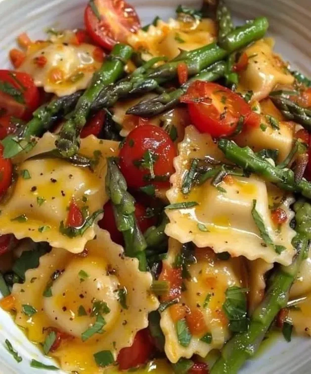 This vibrant pasta dish combines tender cheese ravioli with juicy cherry tomatoes, crisp asparagus, and fragrant garlic — all tossed in olive oil and fresh herbs. It’s a light yet satisfying meal that captures the essence of Mediterranean comfort food in just minutes.