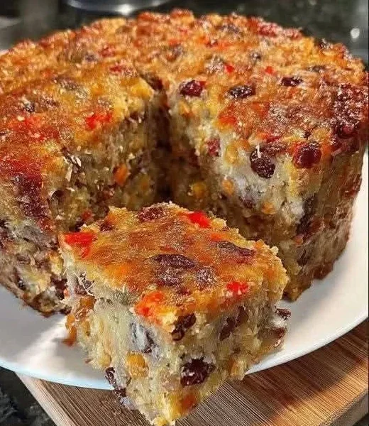 Stir in the soaked fruits (and any remaining liquid), then fold in the dry ingredients and nuts.