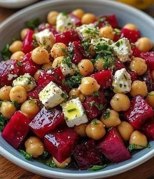 This colorful salad combines tender chickpeas, roasted beets, and creamy feta, all tossed in a zesty lemon-garlic vinaigrette. It’s protein-packed, vegetarian, and full of fresh Mediterranean flavor — perfect for lunch, potlucks, or as a stunning side dish!