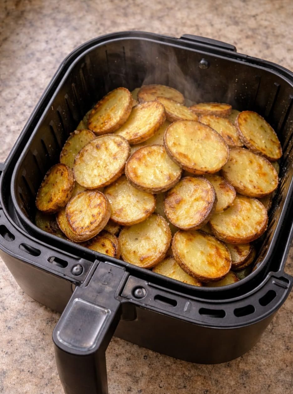 The potato slices should be golden brown and crispy. If needed, you can air fry for a few extra minutes to reach your desired level of crispiness.