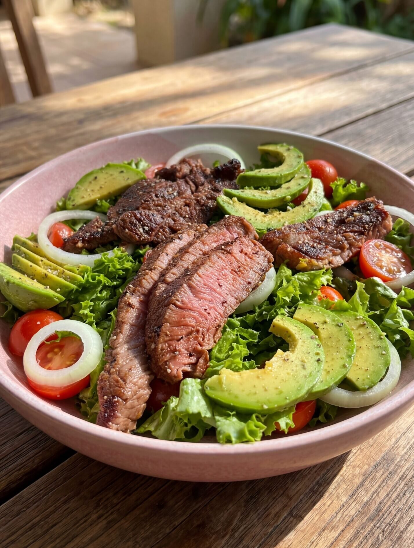 A flavorful, protein-packed salad with tender steak, crisp veggies, and a tangy dressing.