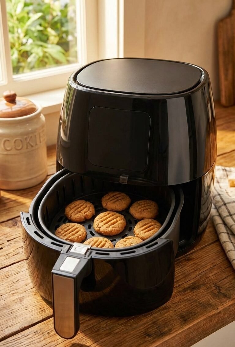 These small-batch peanut butter cookies come together with simple pantry ingredients and cook beautifully in the air fryer. They’re slightly chewy with that classic crisscross fork pattern and deep roasted peanut flavor. Perfect for a quick dessert craving!