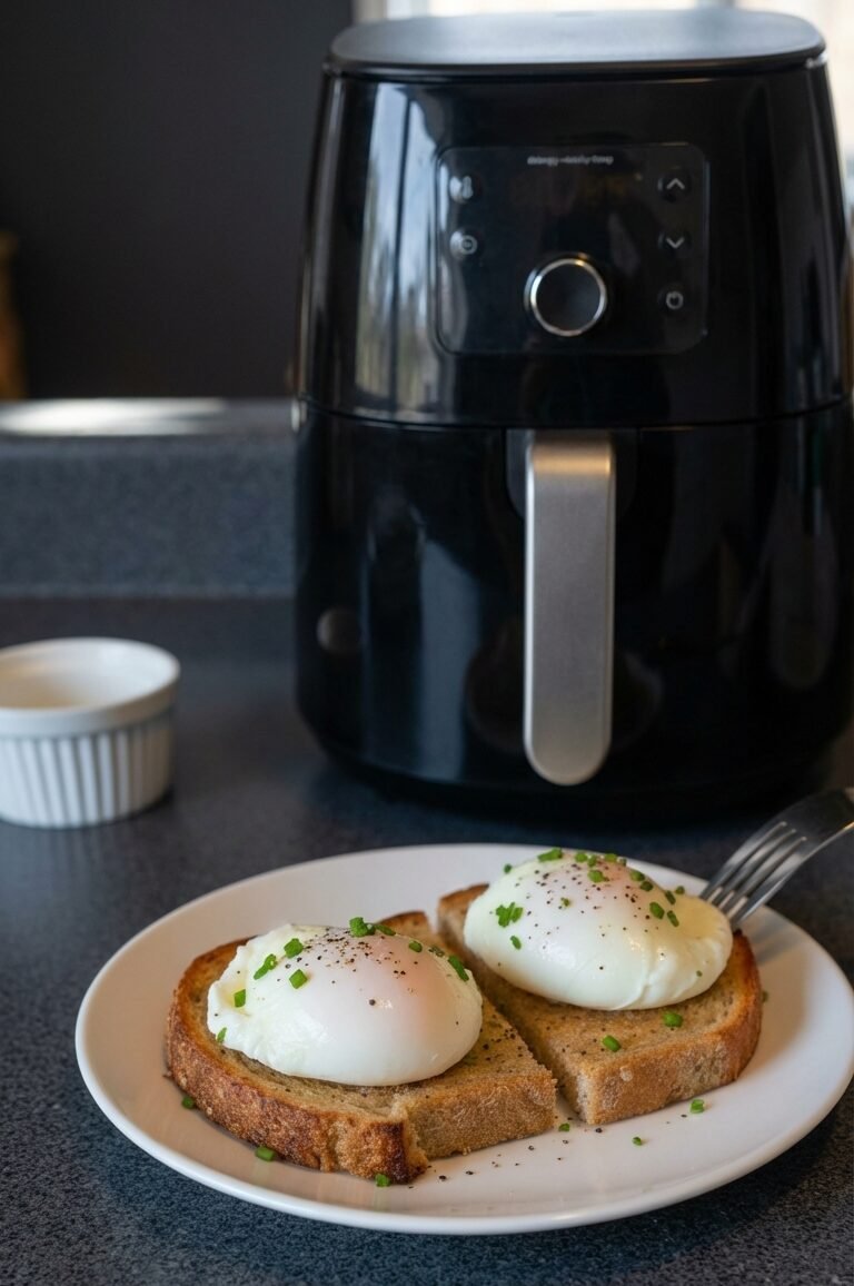 These air fryer poached eggs are tender, silky, and perfectly set with a golden, runny center. No swirling water, no vinegar tricks — just a ramekin and your air fryer. Served over crisp toast and finished with salt, pepper, and fresh chives, this is an easy, high-protein breakfast that feels fancy but takes minutes to make.