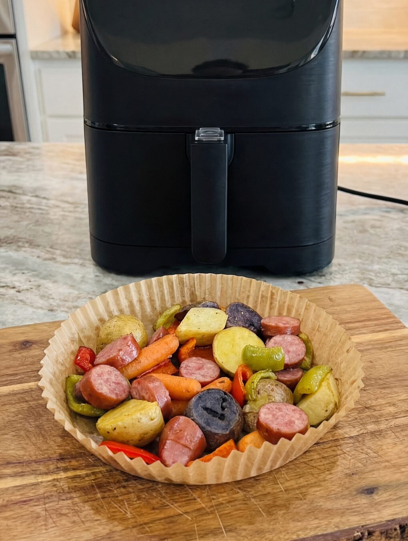 Raw sausage (Italian links): Yes — slice and air fry 5 minutes alone, then add veggies and continue cooking