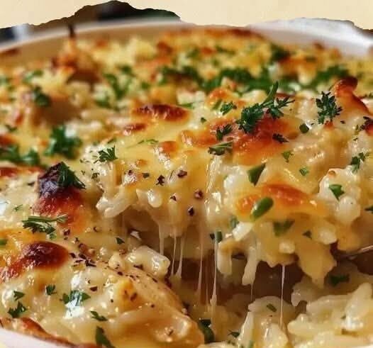 In a large mixing bowl, combine the cooked chicken, rice, butter and cream cheese mixture, cream of chicken soup, garlic, Italian dressing mix, chicken stock, half of the shredded cheese, salt, and pepper.