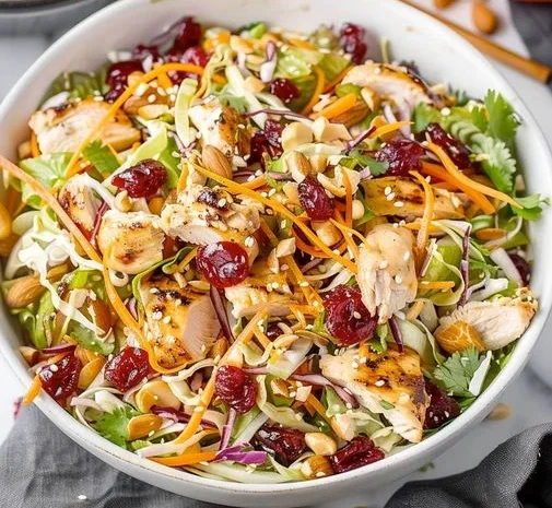 In a large bowl, layer the coleslaw mix, chopped chicken, toasted almonds, dried cranberries, diced red onion, sesame sticks (if using), and chopped cilantro.