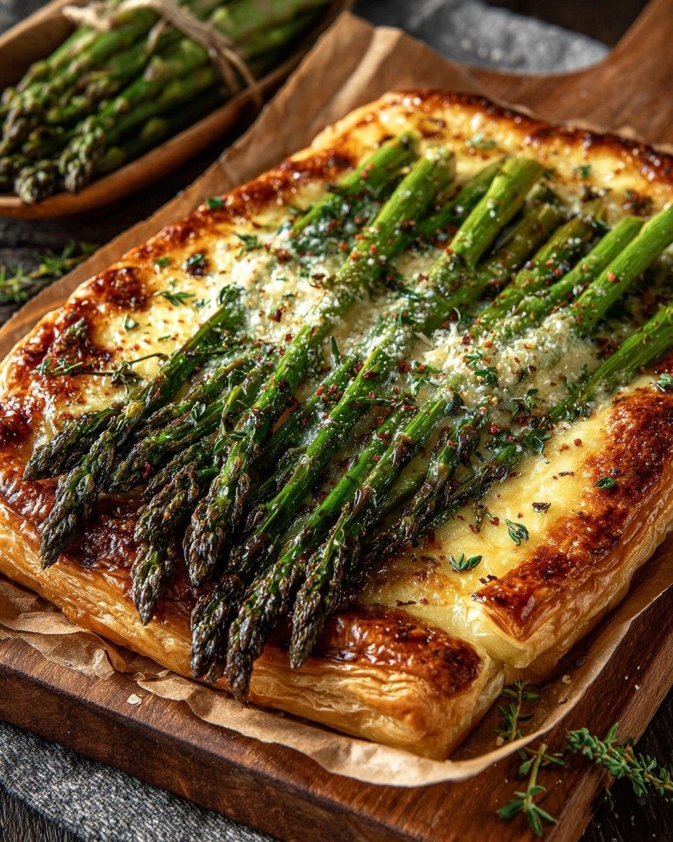 6. Assemble tart: Sprinkle Gruyère evenly inside the border. Pour egg mixture over cheese. Arrange asparagus neatly on top.