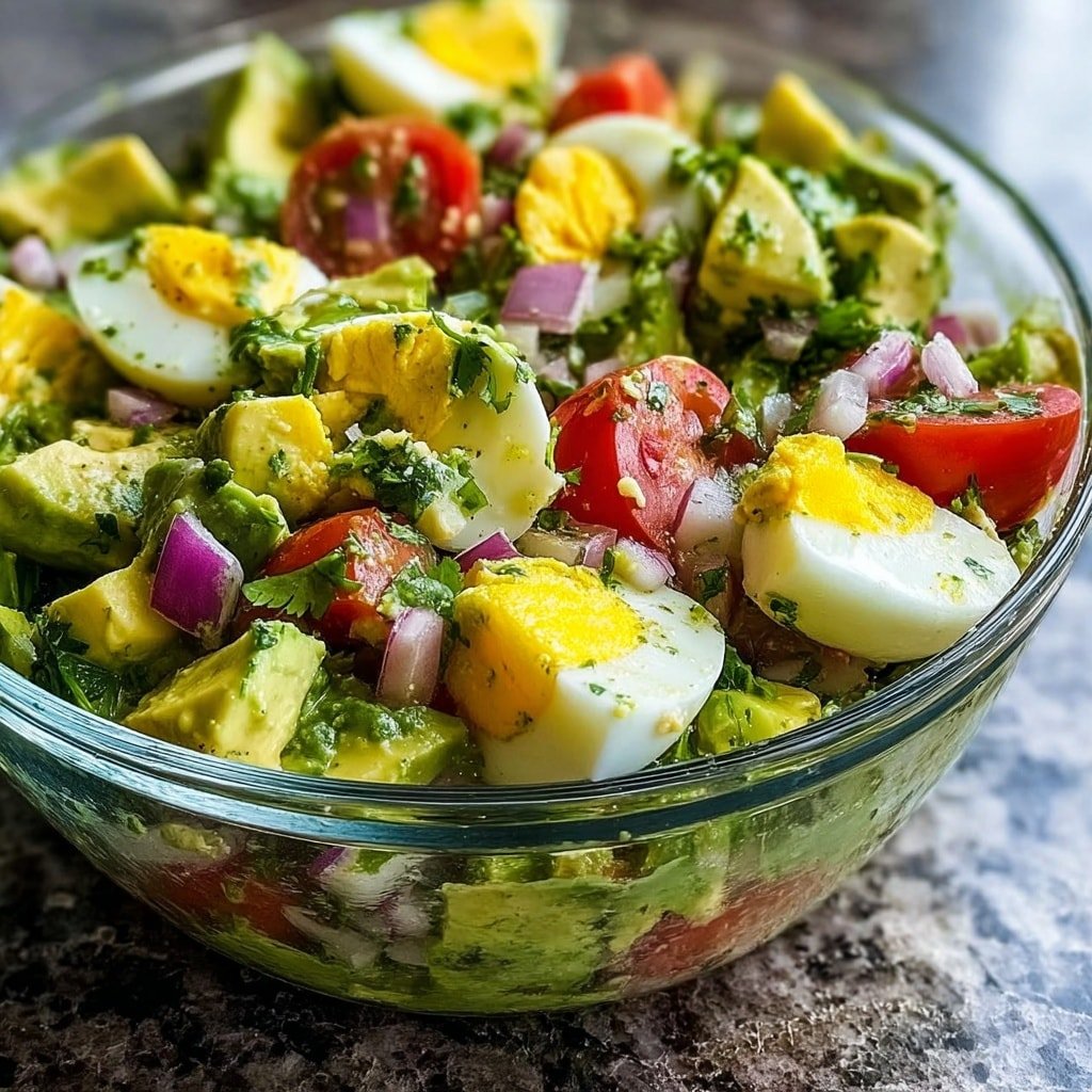 Peel and chop the boiled eggs. Dice the avocados and halve the cherry tomatoes. Finely chop the onion and cilantro.