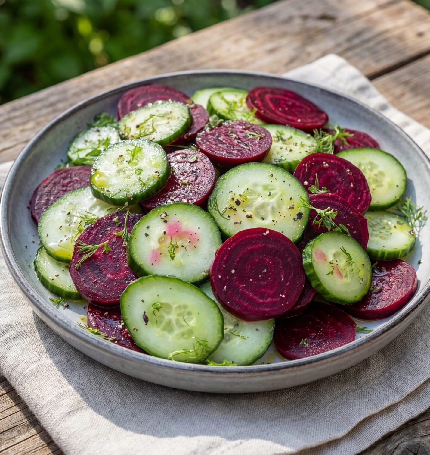 In a large mixing bowl or platter, arrange the beet slices and cucumber slices in alternating layers or in a circular pattern, like in the image.