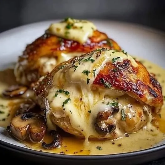 Stuff each chicken breast with the mushroom mixture and cheese mixture.