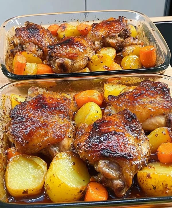 8. Place potatoes in a baking dish, add chicken thighs on top, and pour the honey sauce over.