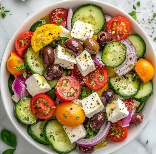 5️⃣ Toss gently (optional — in authentic Greek style, it’s often left unmixed).
