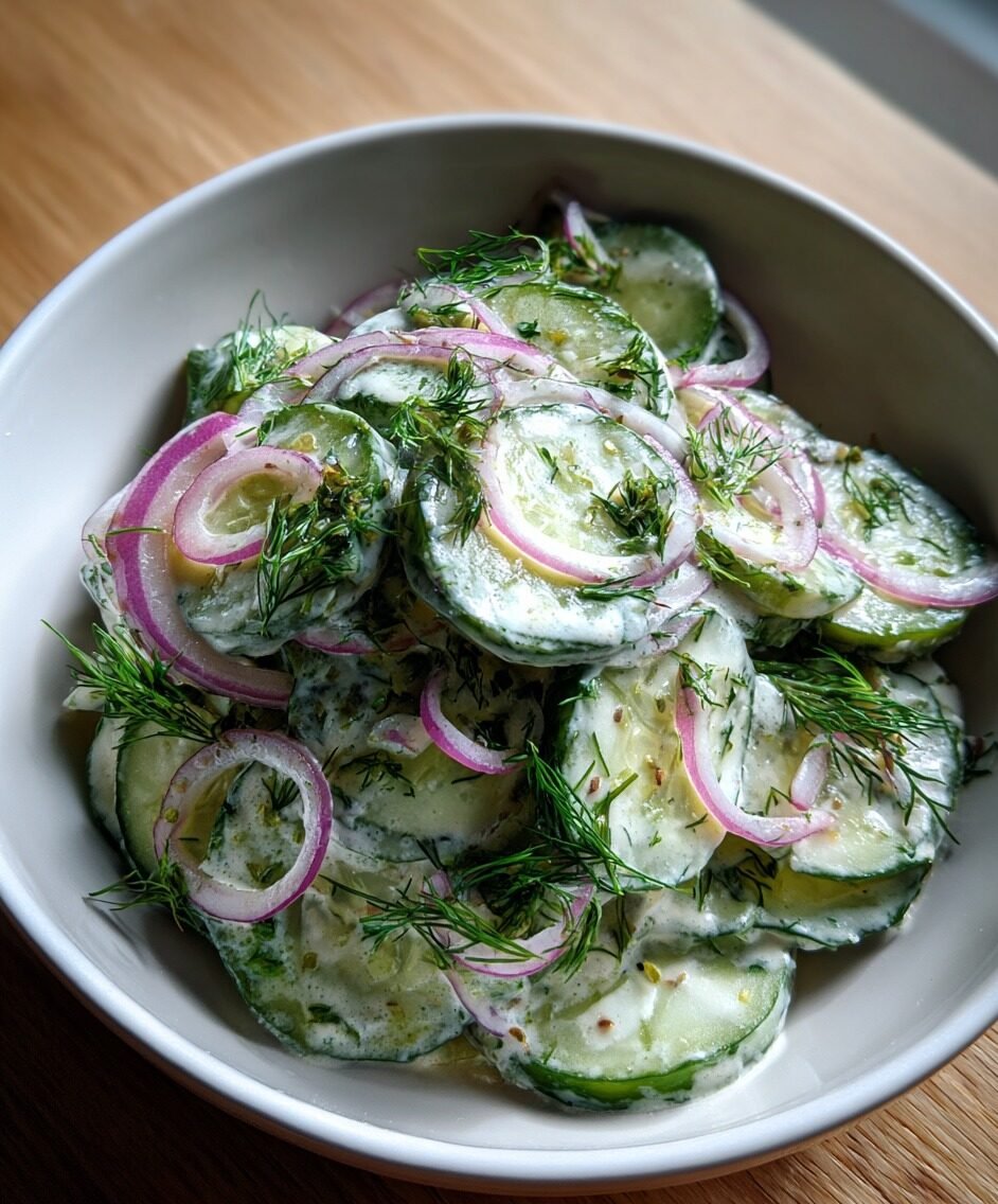 A creamy, tangy cucumber salad with fresh dill, onion, and a smooth dressing. Takes 10 minutes and pairs wonderfully with grilled meats, picnics, or light lunches.