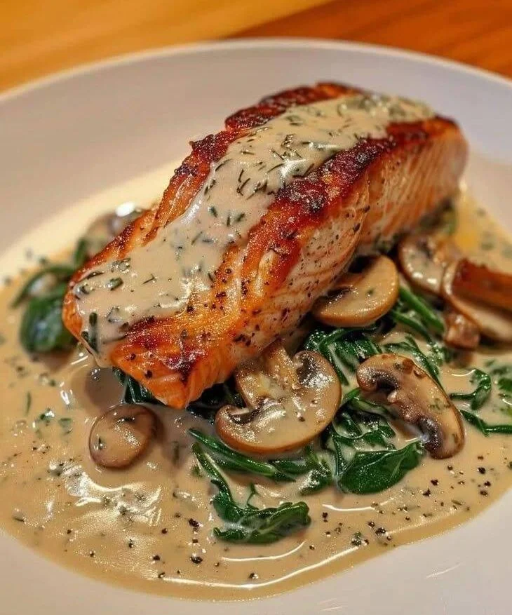 A rich and elegant salmon dish featuring crispy pan-seared fillets served with a creamy garlic sauce infused with mushrooms, spinach, herbs, and a touch of Parmesan. Perfect for a quick yet impressive dinner — ready in under 30 minutes!