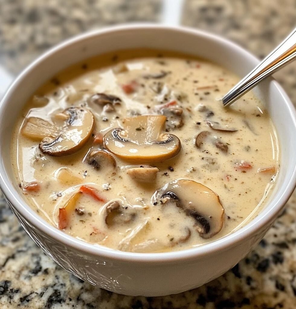 A velvety, savory soup made with deeply browned mushrooms, garlic, and herbs, finished with cream for a luxurious texture. Perfect as a starter or a comforting main with crusty bread.