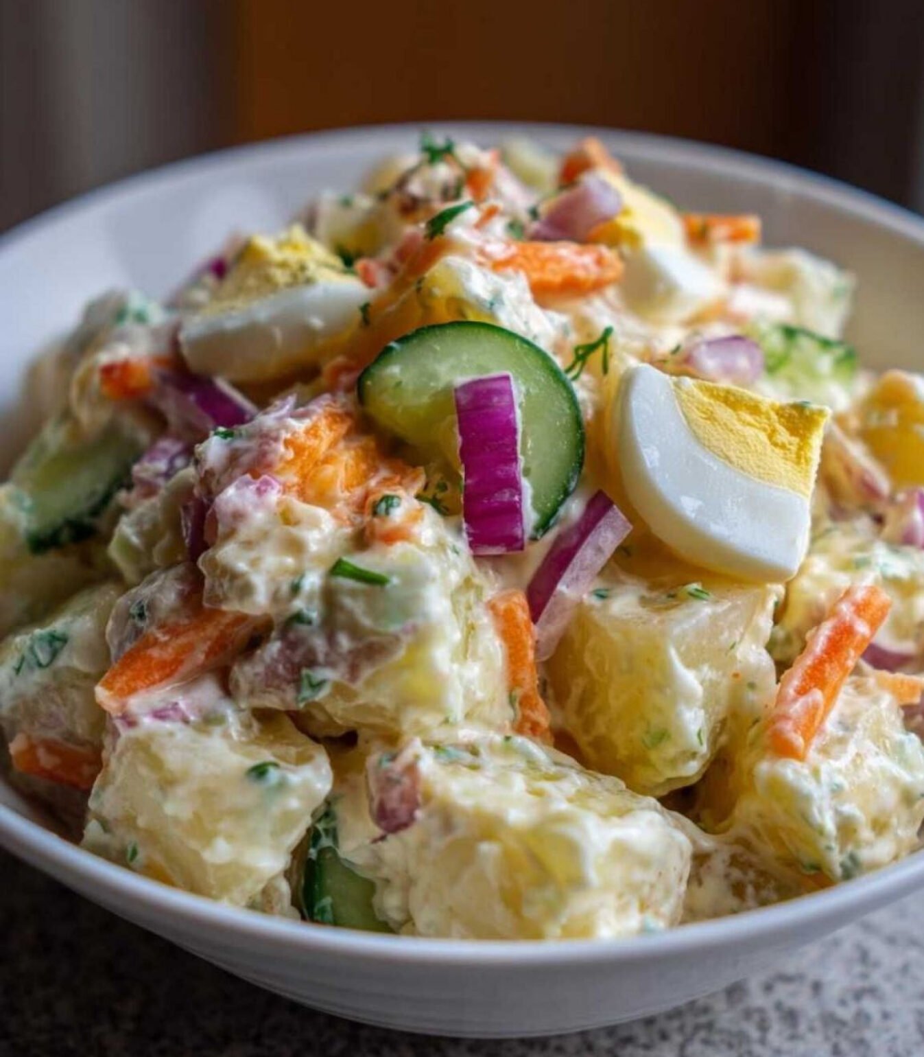 Gently fold in warm (not hot) potatoes so they absorb flavor.