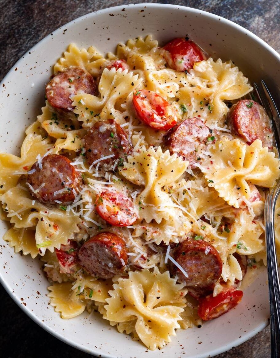 A delicious and creamy pasta dish with browned sausage, cherry tomatoes, and Parmesan cheese — all tossed with bowtie pasta for the perfect comfort meal.