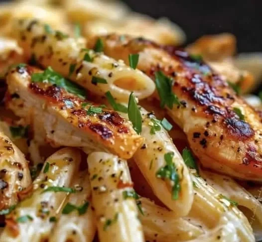 Combine the cooked penne with the creamy chicken mixture, mixing thoroughly.