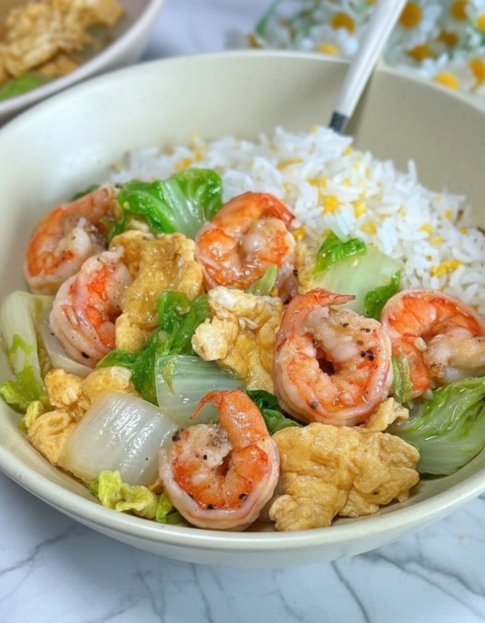 Juicy shrimp, tender-crisp bok choy, and soft scrambled eggs tossed in a light savory sauce. Serve it over rice and dinner is done.