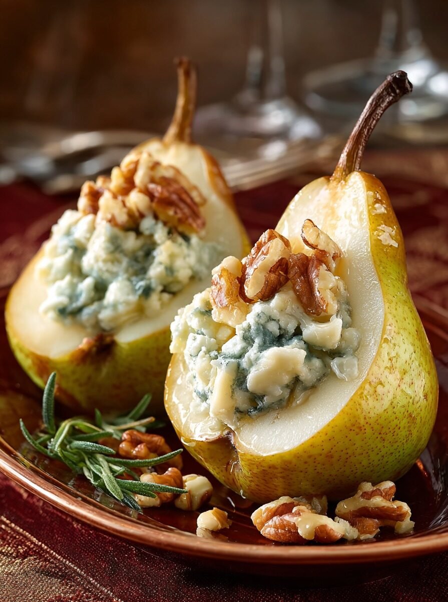 • Fill fresh pear halves with blue cheese + nuts → serve chilled.
