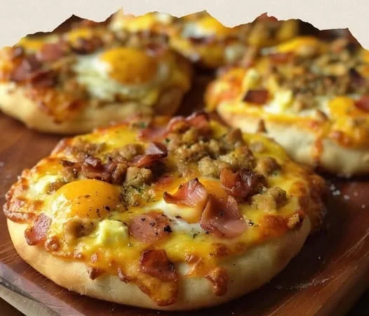 Assemble the Pizzas: Spoon the scrambled eggs onto each muffin half. Top with shredded mozzarella cheese, diced bell peppers, crumbled bacon, and halved cherry tomatoes.