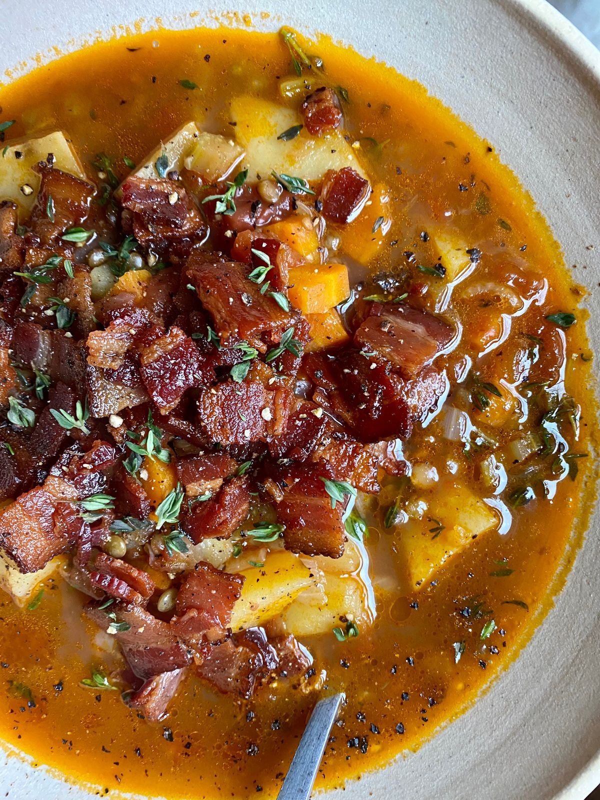 ✅ Yes! Skip the bacon and use olive oil for sautéing. You can add smoked paprika or a dash of soy sauce for that smoky flavor.
