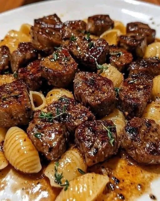 Rich, savory seared steak bites tossed with pasta shells in a buttery, herbed sauce.