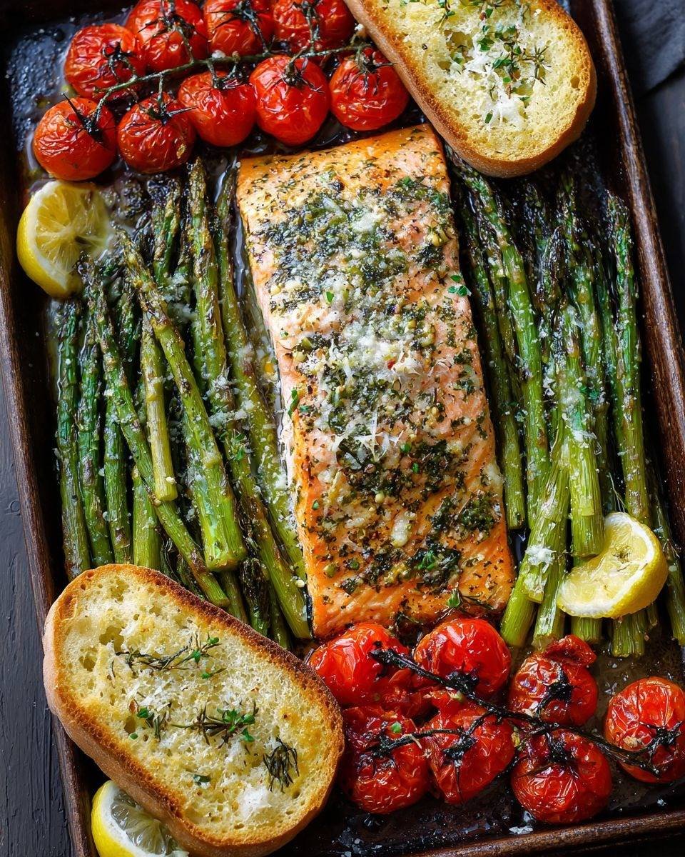 Fresh, flaky salmon baked with garlic, herbs, and roasted veggies — all on one pan. Easy cleanup, big flavor.