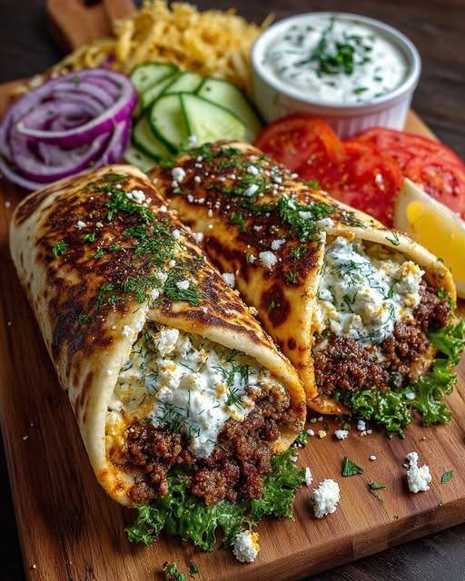 Juicy seasoned beef wrapped in warm pita with fresh veggies and a creamy dill feta sauce — perfect for lunch or dinner!