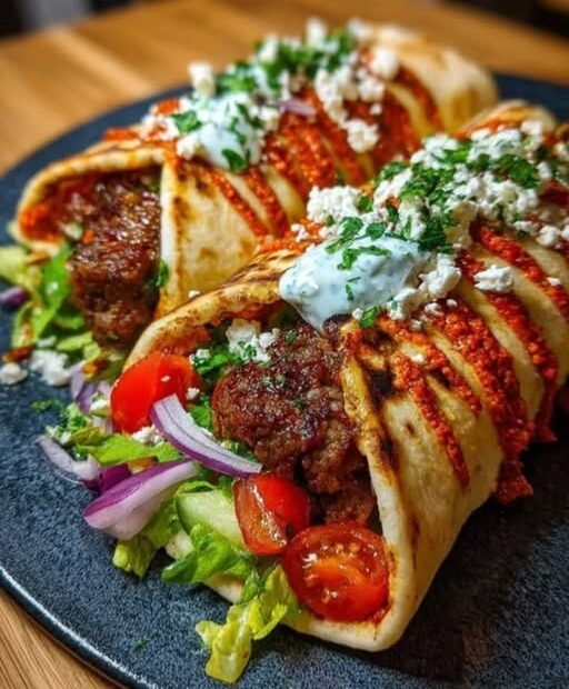 🥙 Greek Beef Wraps with Roasted Red Pepper Sauce