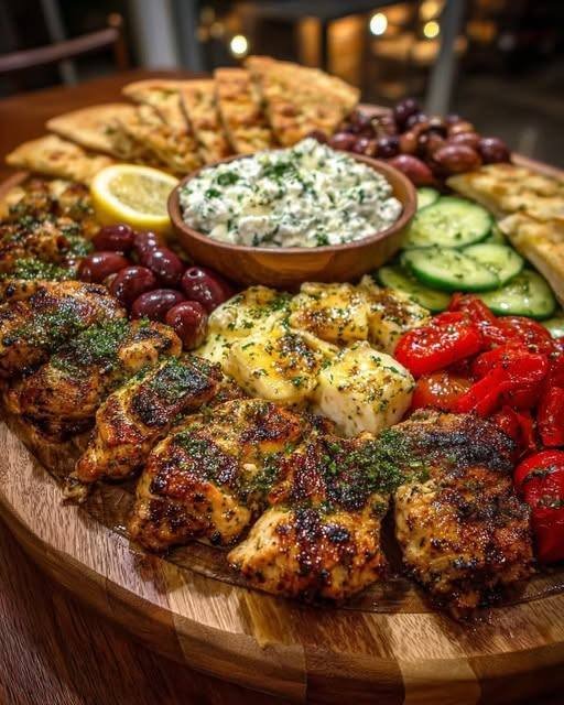Greek Chicken Souvlaki Grazing Board with Feta Dip