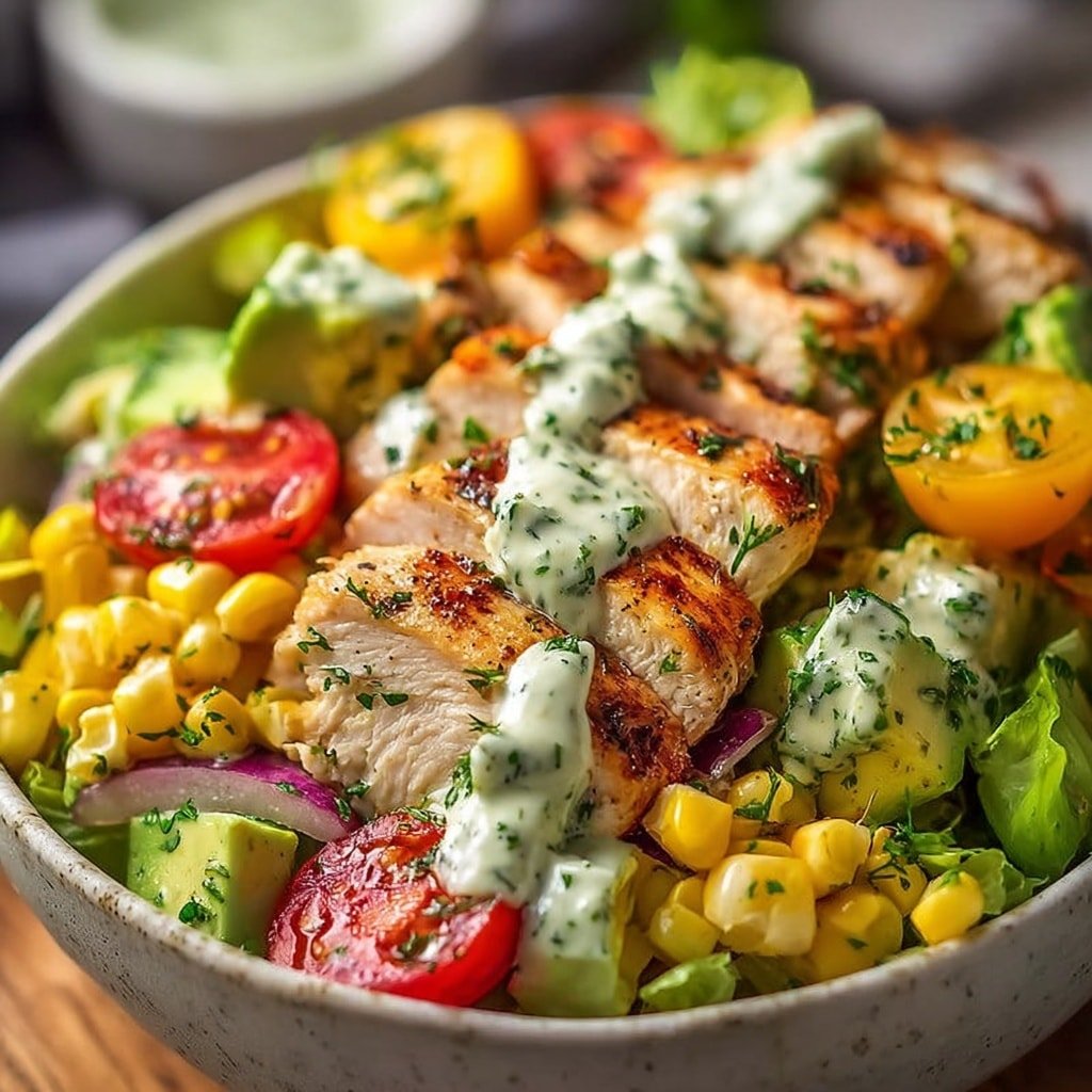 A refreshing, protein-packed salad made with juicy grilled chicken, creamy avocado, crisp veggies, and a bright homemade dressing.