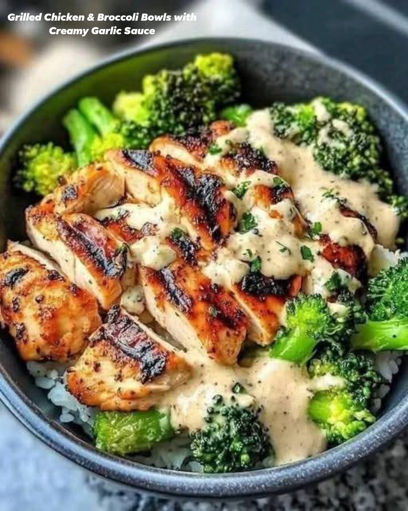 Grilled Chicken & Broccoli Bowls with Creamy Garlic Sauce