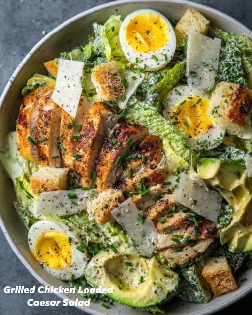 3. Add grilled chicken slices, croutons, shaved parmesan, tomatoes, bacon bits, and boiled egg slices.
