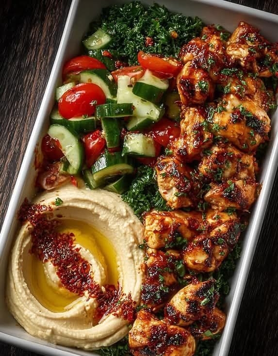 🥙 Grilled Chicken Skewers with Hummus and Mediterranean Salad