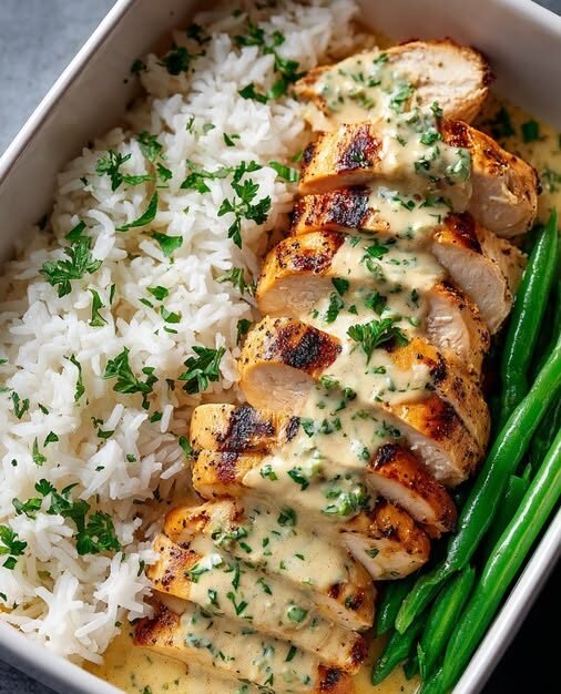 🥘 Grilled Chicken with Dijon Cream Sauce, Rice & Green Beans