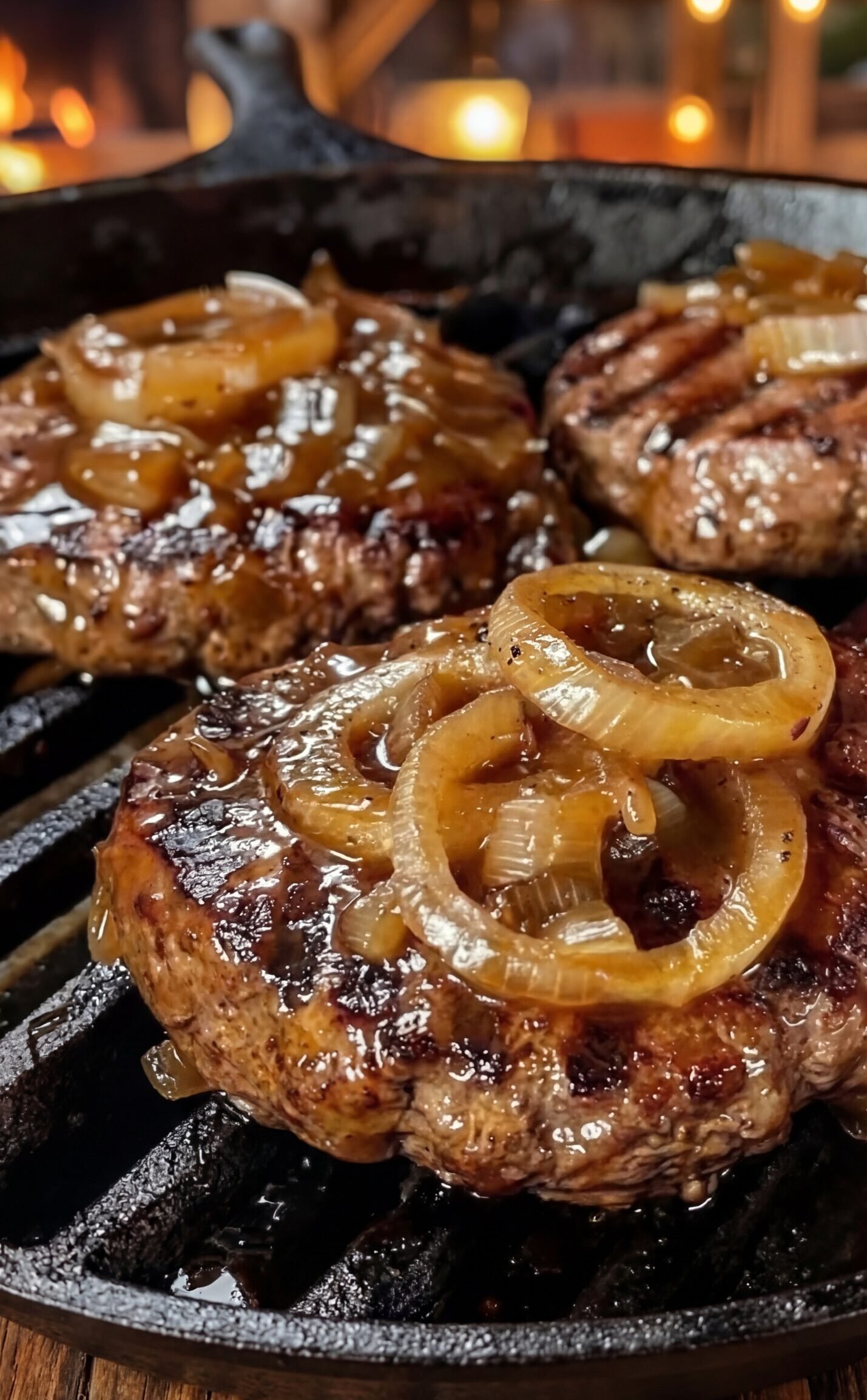 A hearty hamburger steak made with seasoned ground beef, grilled to perfection and topped with sweet, deeply caramelized onions.
