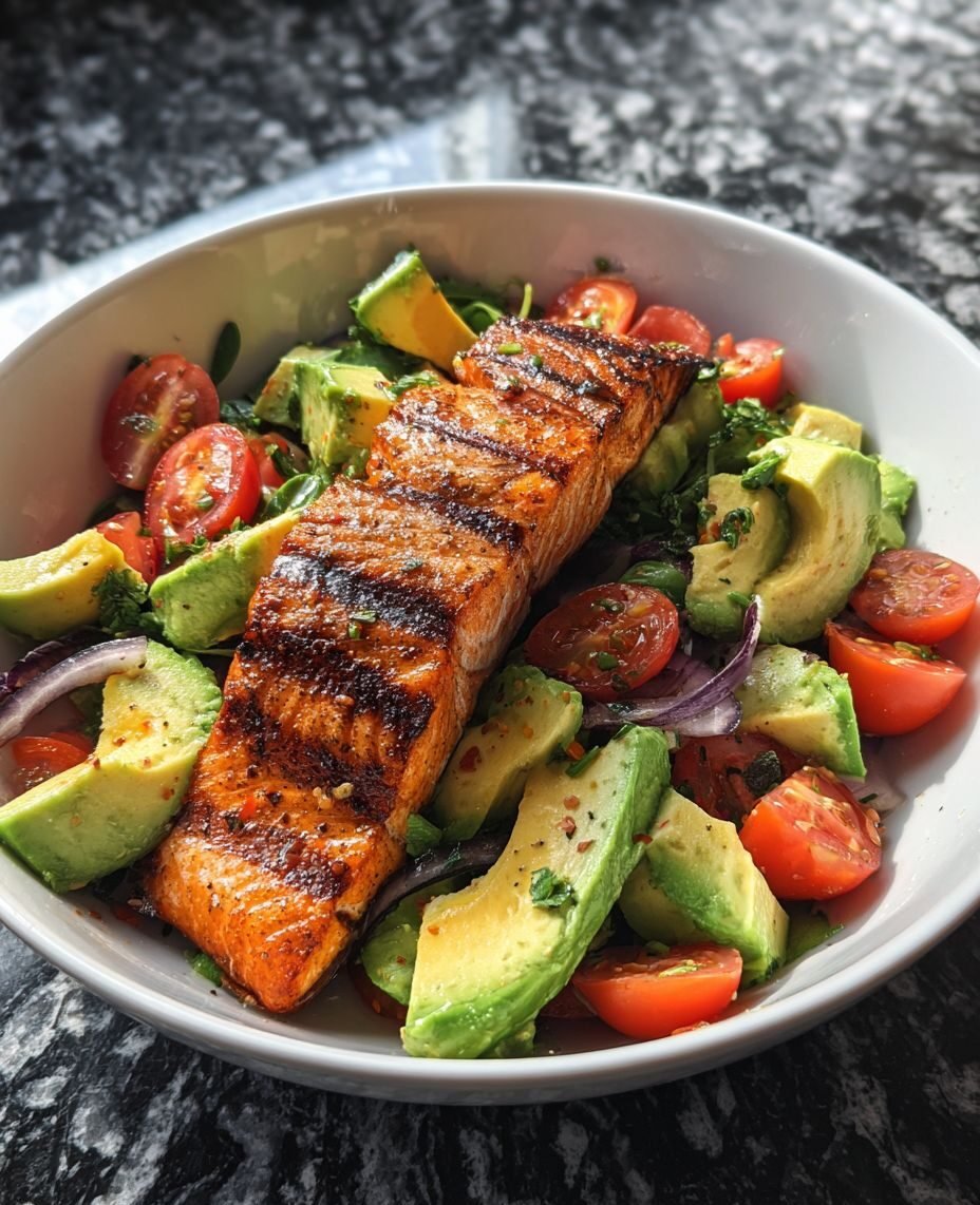 A fresh, vibrant salad made with juicy grilled salmon, creamy avocado, crisp veggies, and a zesty lemon-herb dressing. Light, healthy, and ready in under 30 minutes!