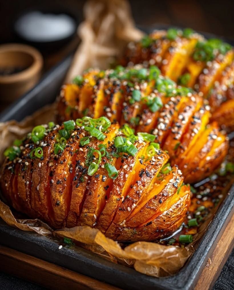 The Hasselback technique allows the sweet potatoes to cook evenly while creating crispy edges that contrast beautifully with the tender interior. The maple-miso butter adds a sweet-savory glaze that enhances the natural sweetness of the sweet potatoes, while the miso introduces a deep umami flavor. The balance of sweet, salty, and slightly tangy flavors makes this dish truly irresistible.