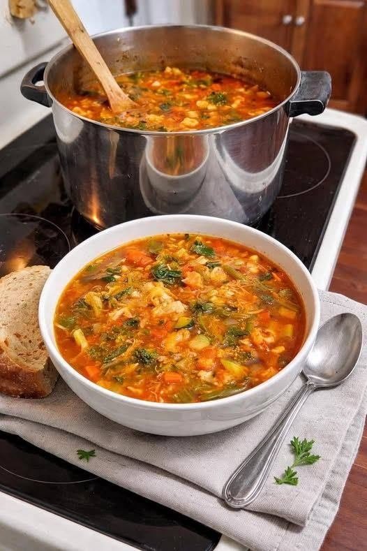 This comforting bowl looks like a wholesome, homemade vegetable chicken soup packed with colorful veggies, tender shredded chicken, and a flavorful broth. It’s warm, nourishing, and perfect for cold days or when you want something light yet filling. The mix of herbs and vegetables gives it a rich taste while still feeling healthy and balanced.