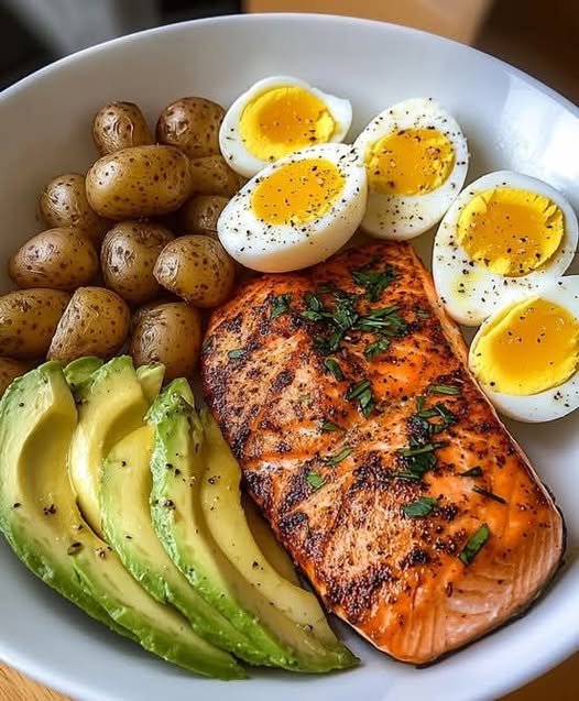 Herb Baby Potatoes with Seasoned Salmon, Soft-Boiled Eggs & Avocado Plate