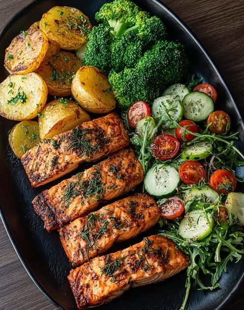 🌿 Herb-Grilled Salmon with Garlic Potatoes, Broccoli & Fresh Salad
