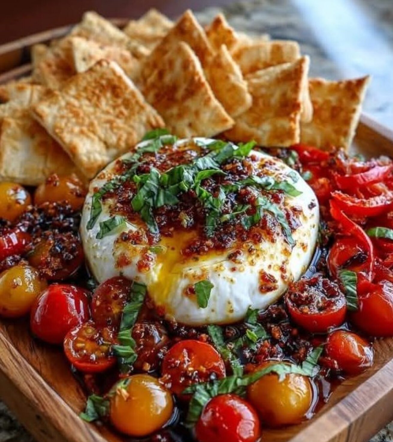 A perfect crowd-pleaser combining creamy burrata, sweet-spicy hot honey, and crispy pita chips — elegant yet super easy to assemble!