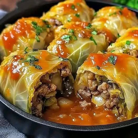 Tender cabbage leaves wrapped around a flavorful beef & rice filling, simmered in rich tomato sauce — pure comfort food!