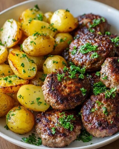 Juicy Beef Patties with Roasted Potatoes