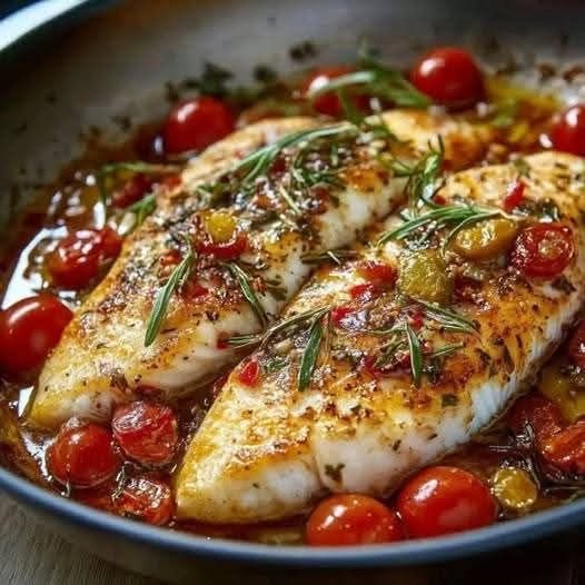 Add toppings: Scatter cherry tomatoes, olives, and red onions around the fillets.