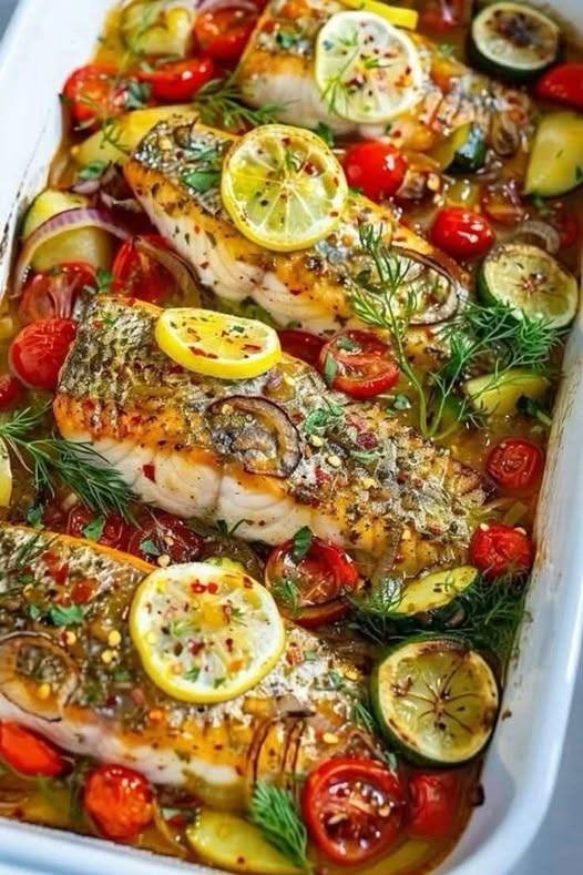 Bake uncovered for 18–22 minutes, or until the fish flakes easily with a fork and vegetables are tender.
