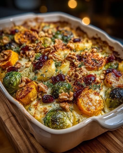 This Mediterranean-inspired gratin is cozy, layered, and quietly elegant. Roasted sweet potatoes bring natural sweetness, Brussels sprouts add a gentle bite, and creamy Brie melts into everything without overwhelming it. Toasted walnuts add crunch, while a light cranberry drizzle gives a subtle sweet-tart finish that lifts the whole dish. It works as a vegetarian main for cooler evenings or as a standout side for festive meals. Despite the rich flavors, it feels balanced and thoughtful rather than heavy.