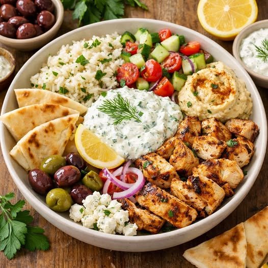 A fresh, protein-packed bowl loaded with juicy Mediterranean chicken, fluffy pita, crisp veggies, and a creamy lemon dill feta sauce. Perfect for lunch or dinner!